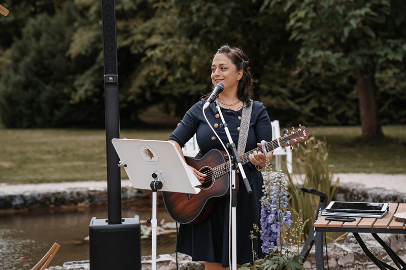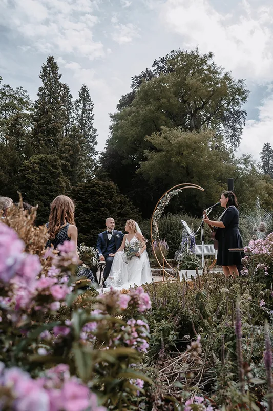 Am Nachmittag durfte ich ihre freie Trauung gestalten und musikalisch begleiten. Entgegen der Wetterprognose blieb es trocken, die Stimmung dafür umso emotionaler. Die Traurede erzählte ihre Geschichte mit Humor, Tiefe und Leichtigkeit. Viel Lachen, Freudentränen, zustimmende Blicke und dieses besondere Gefühl, dass alle wirklich dabei sind.